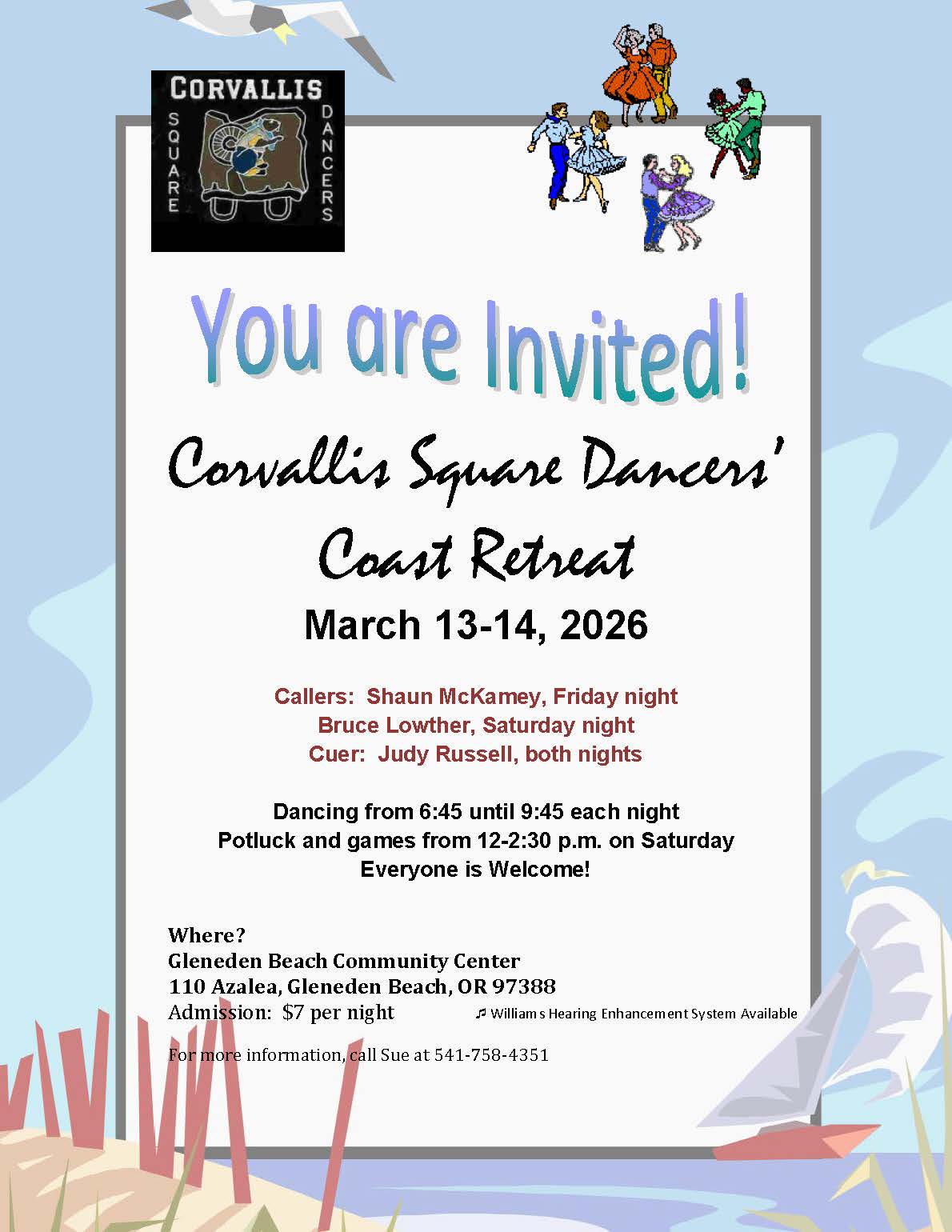 are every 2nd & 4th Saturday at the Improved health, travel, and friendship. Square Dancing is America's best kept secret! It is a great way to have fun while exercising your brain and moving to upbeat music. Square dancing keeps the mind active and the body fit without strenuous workouts. By combining the mental and physical exercise square dancing offers it's a win-win situation for you. Plus it is just plain FUN. Square dancing is the American Folk Dance and an important part of the culture of America. History: The Corvallis Square Dance Club was founded in 1959. We dance on a spacious and comfortable gym floor. We dance mainstream and plus levels. Our dances begin with 15 minutes of round dancing and alternate rounds and squares throughout the evening. New members and visiting dancers are always welcome. Our club dances in September through mid-June. For more information about club activities, call 541-752-1282. |